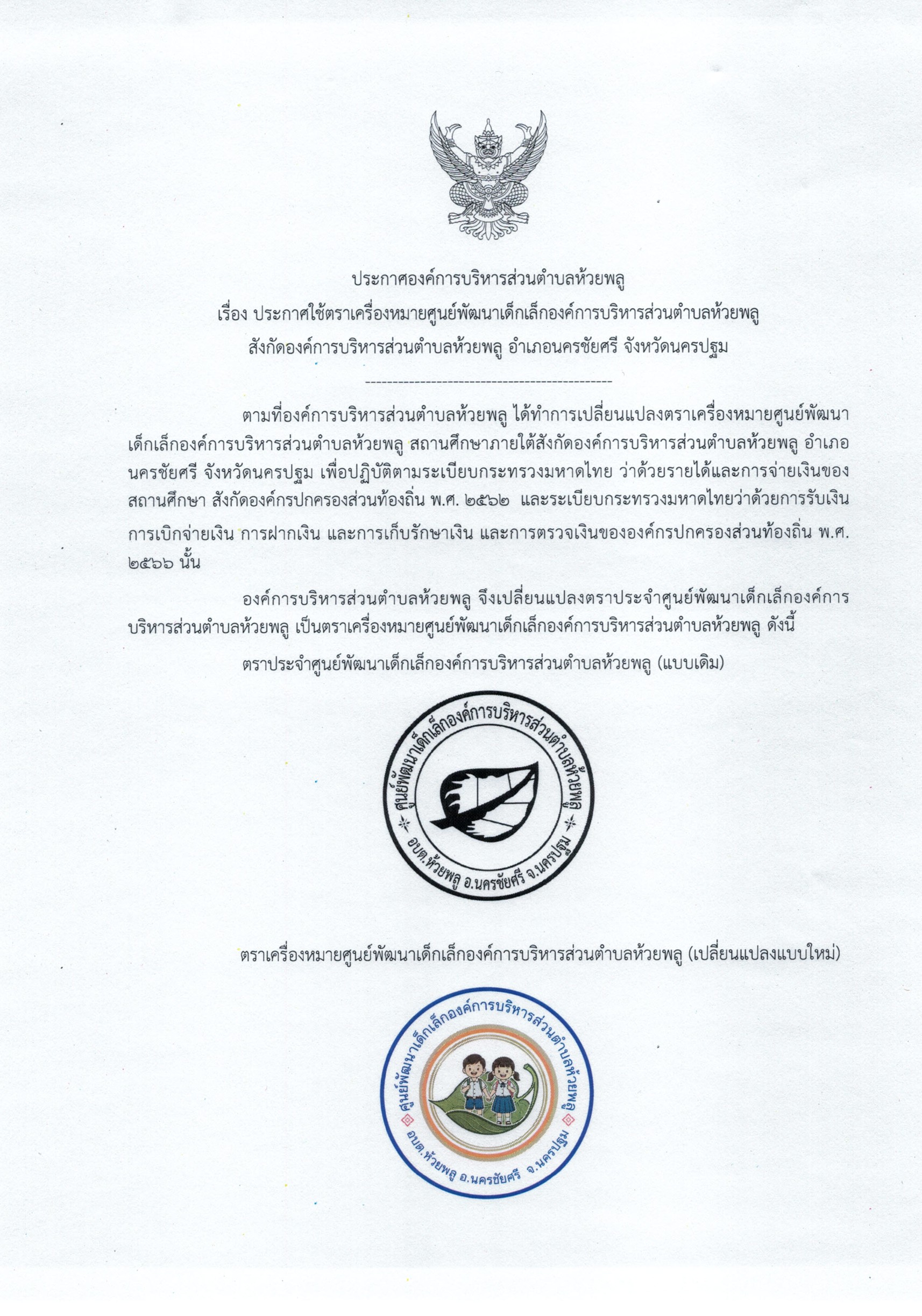 แจ้งประชาสัมพันธ์ ประกาศใช้ตราเครื่องหมายศูนย์พัฒนาเด็กเล็กองค์การบริหารส่วนตำบลห้วยพลู